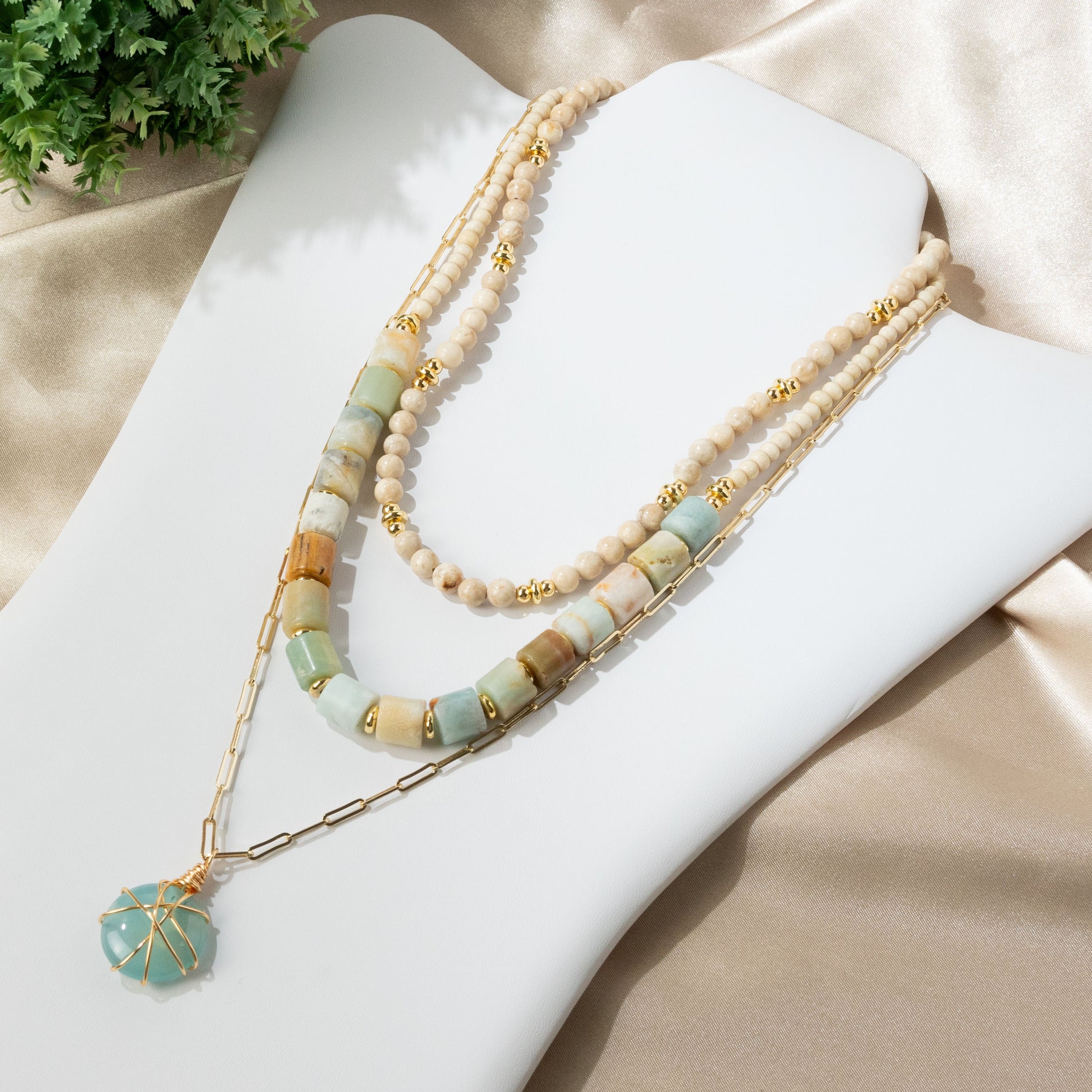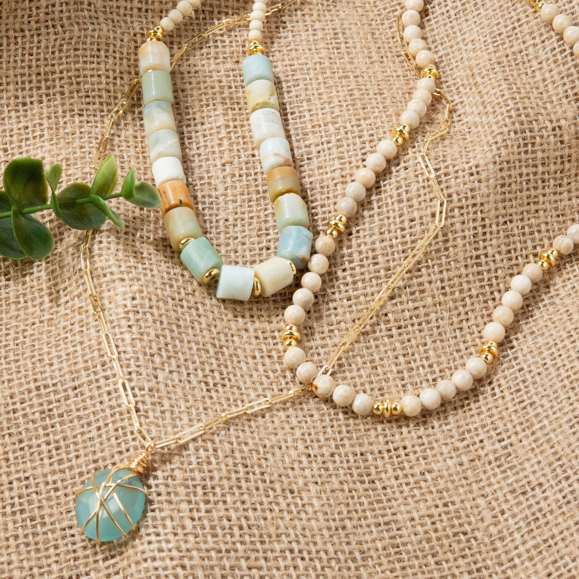 Introducing the Amazonite River Stackable Necklace, designed with carefully selected amazonite, agate, and river stones. The hand-wrapped blue agate pendant adds a unique touch to this stunning piece. Elevate your looks with a touch of nature's beauty.