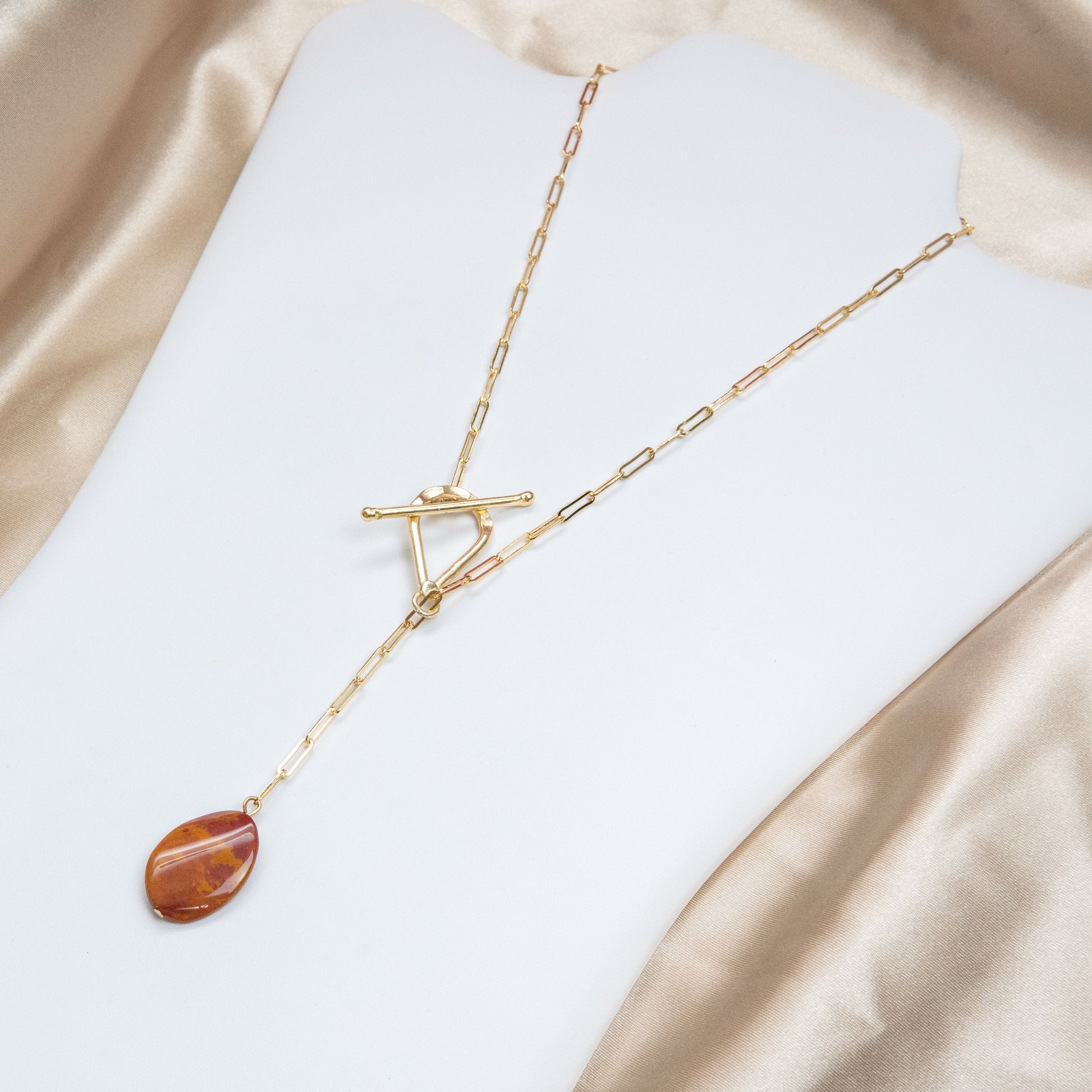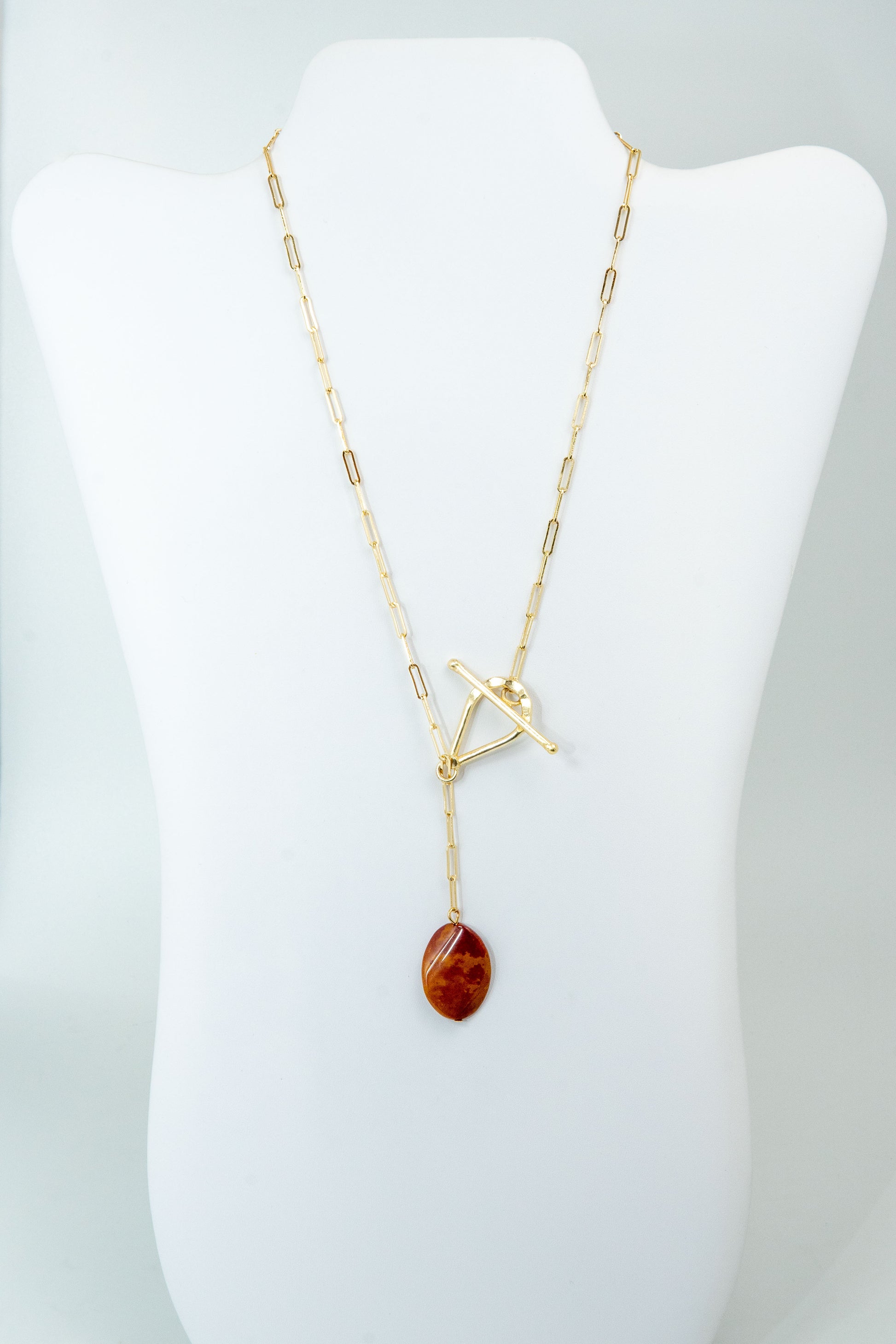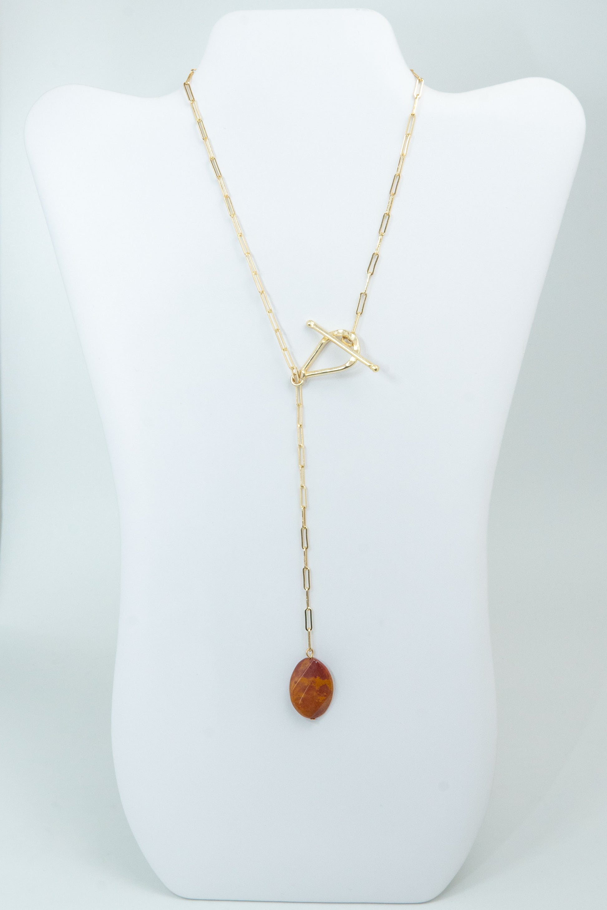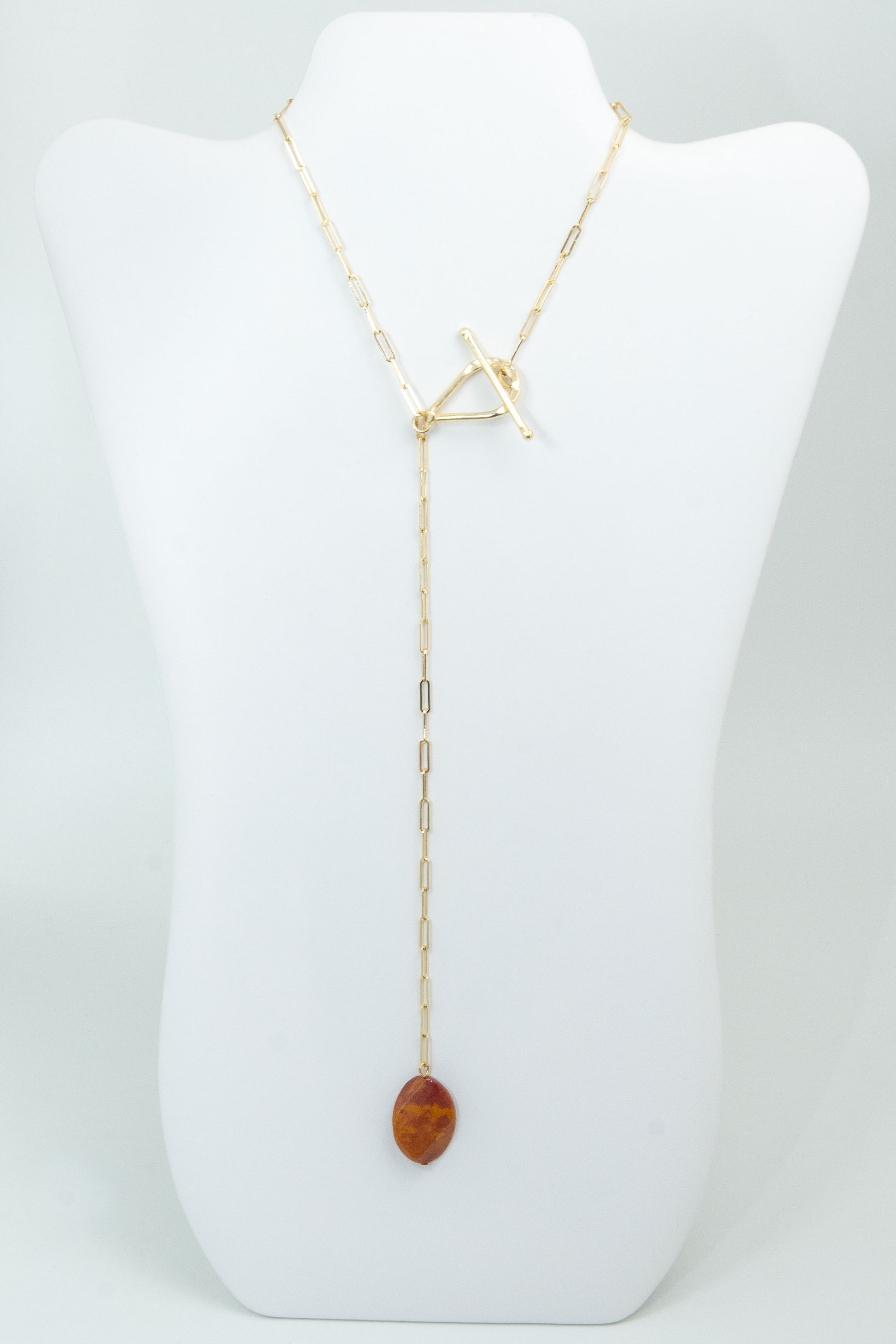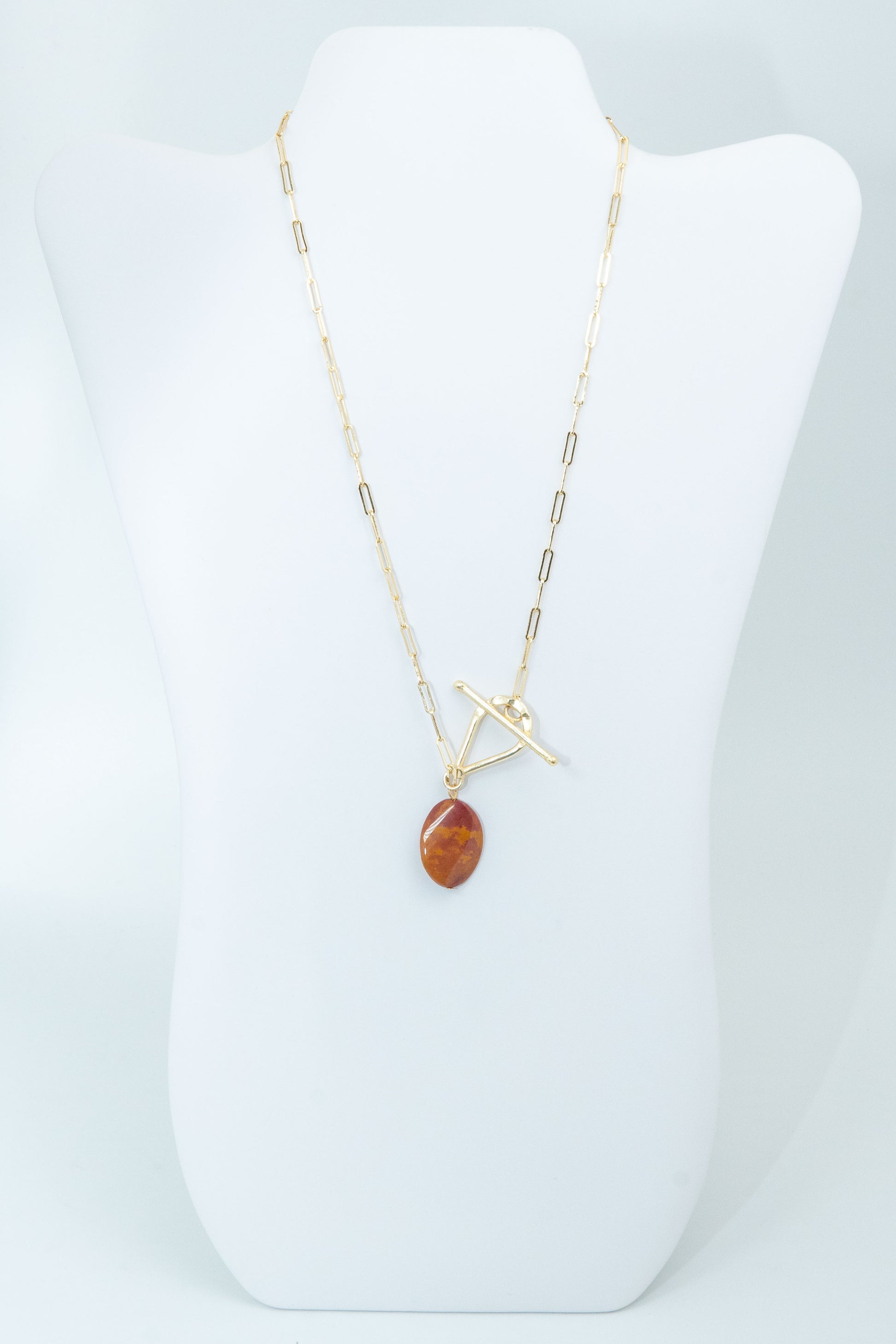 华丽的前钩眼扣件饰有天然红玉髓宝石。