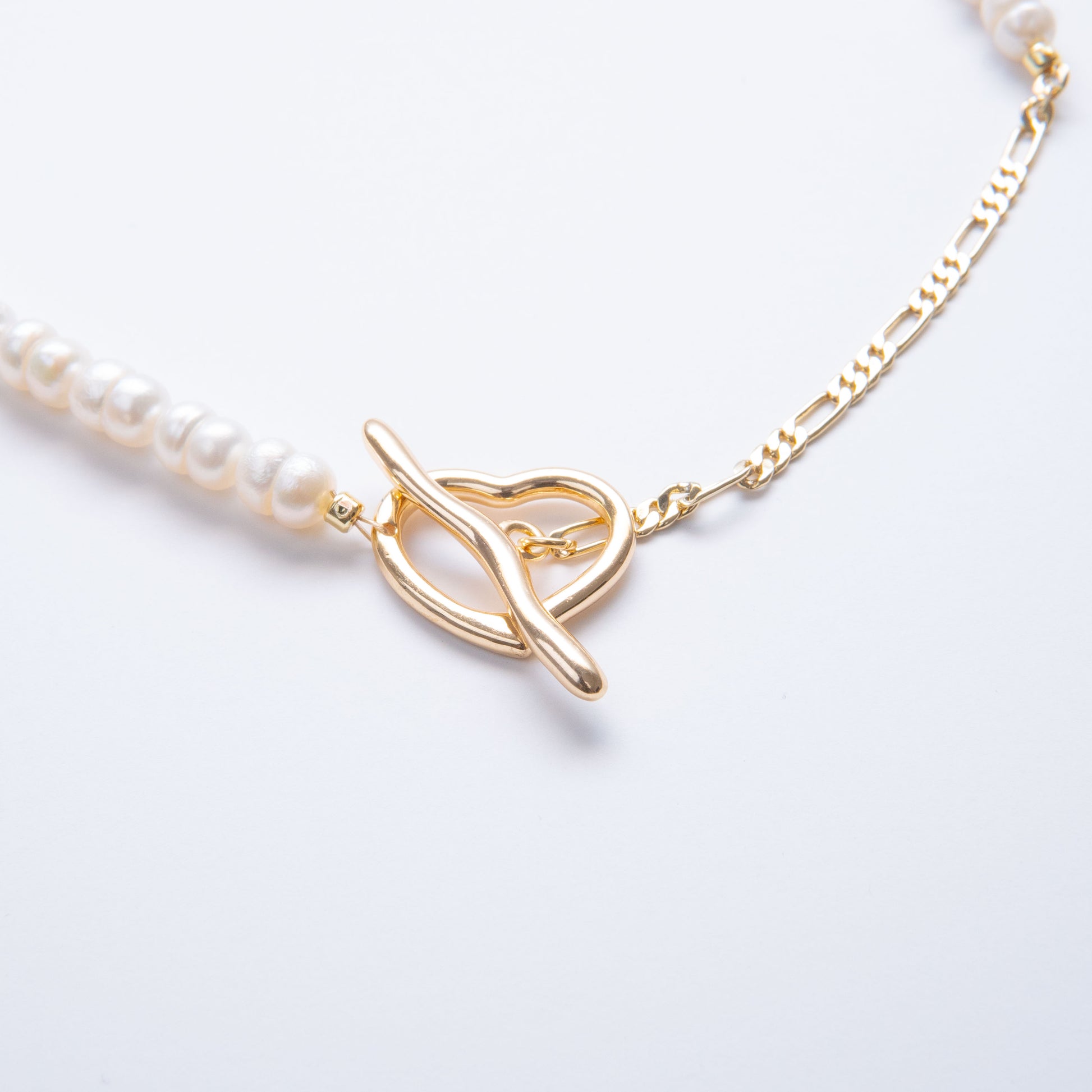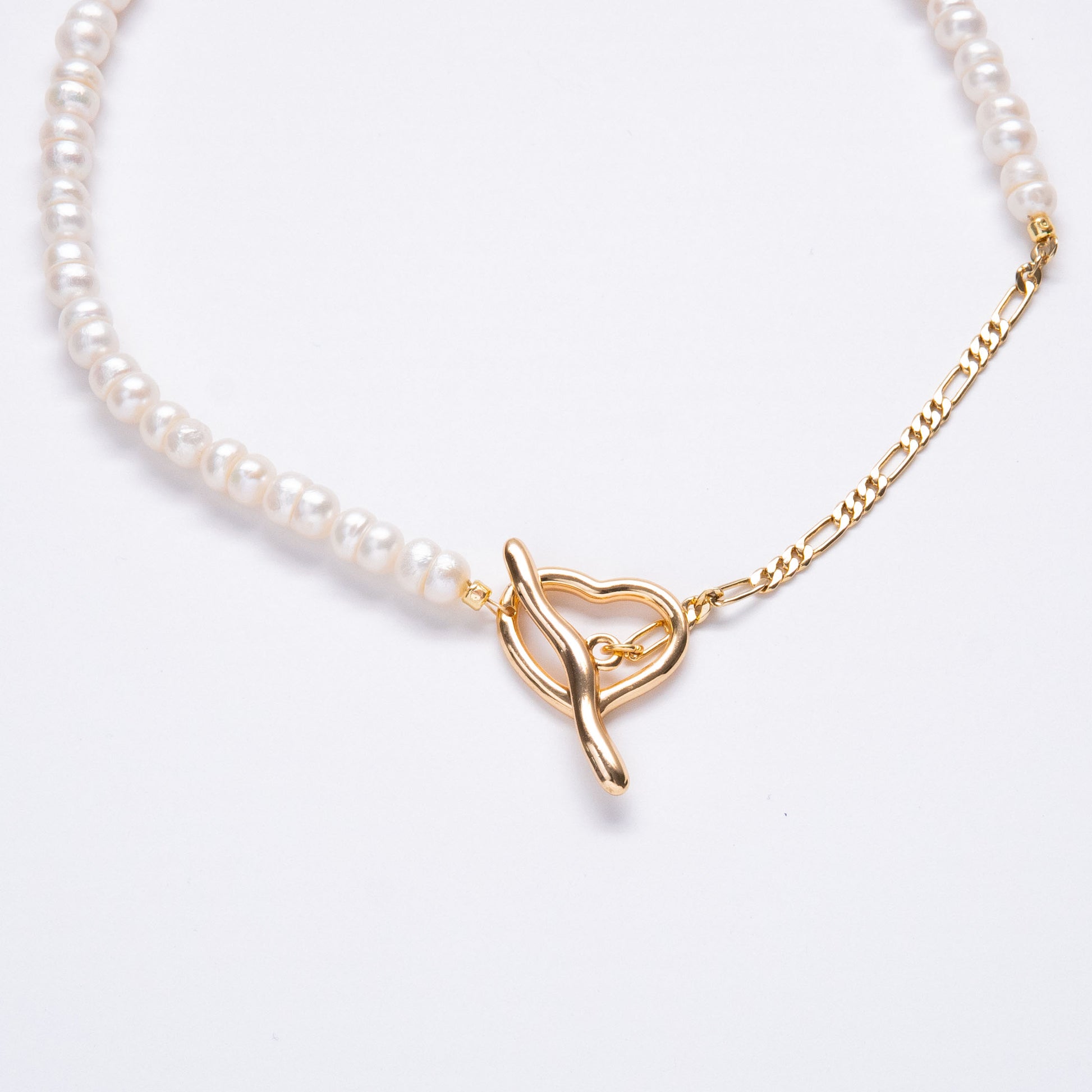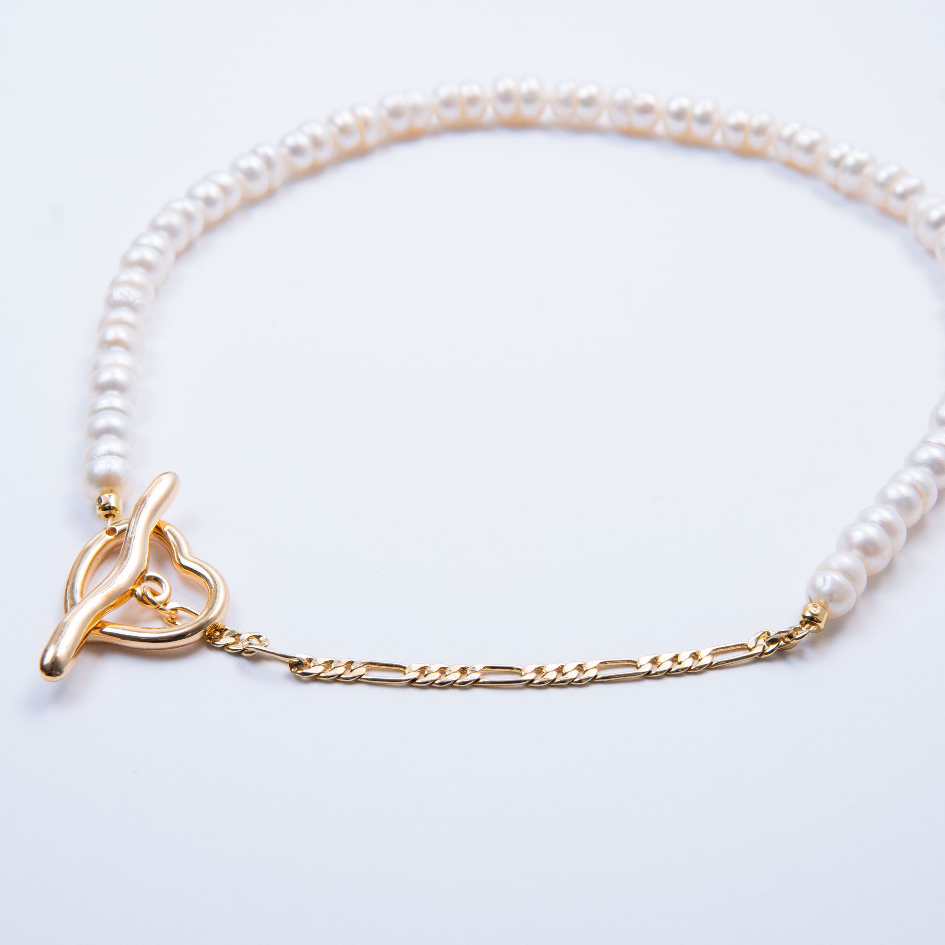 One of a kind 14-inch handmade chocker necklace with white cultured pearls from India styled with a figaro 14k gold filled chain and a beautiful front heart clasp as a statement.