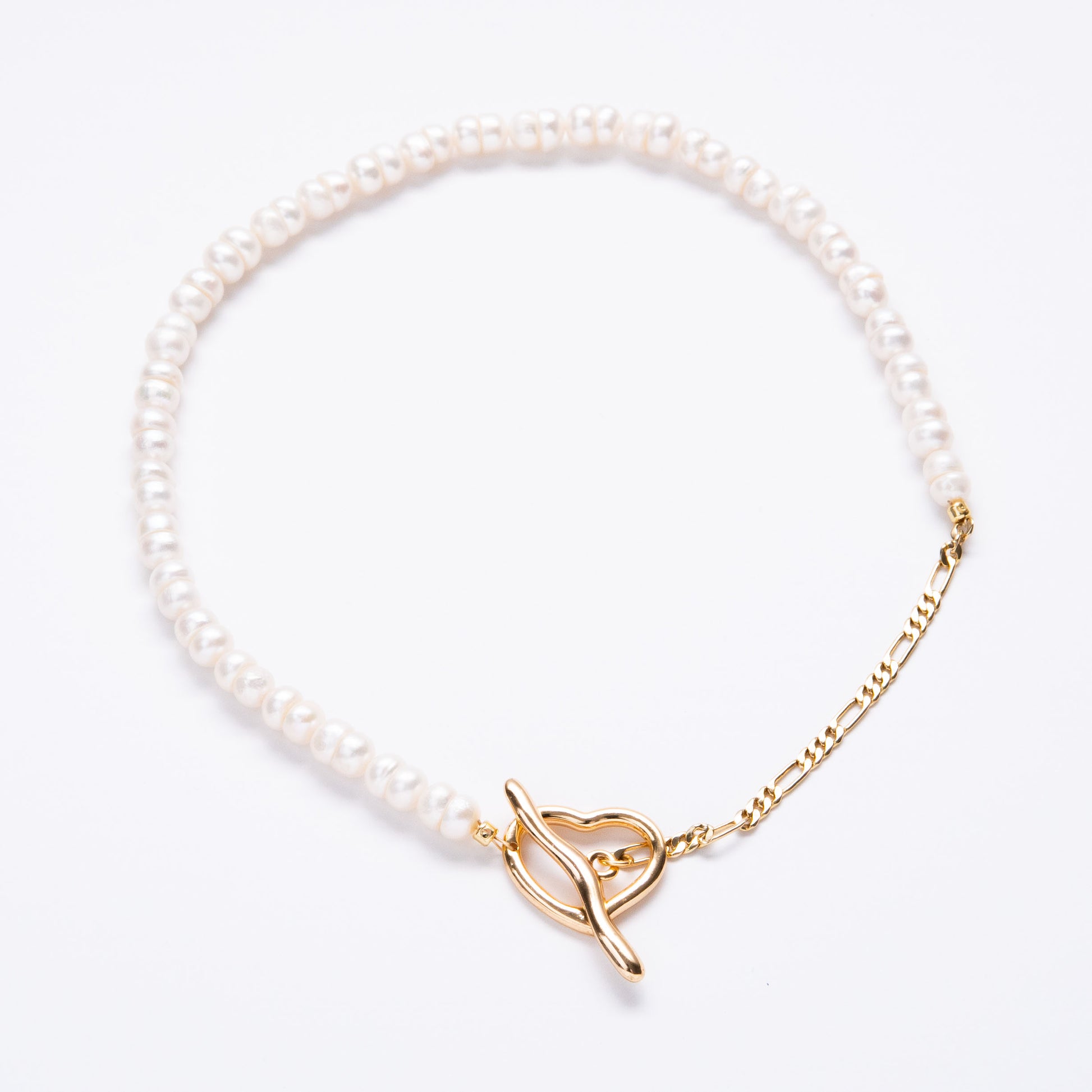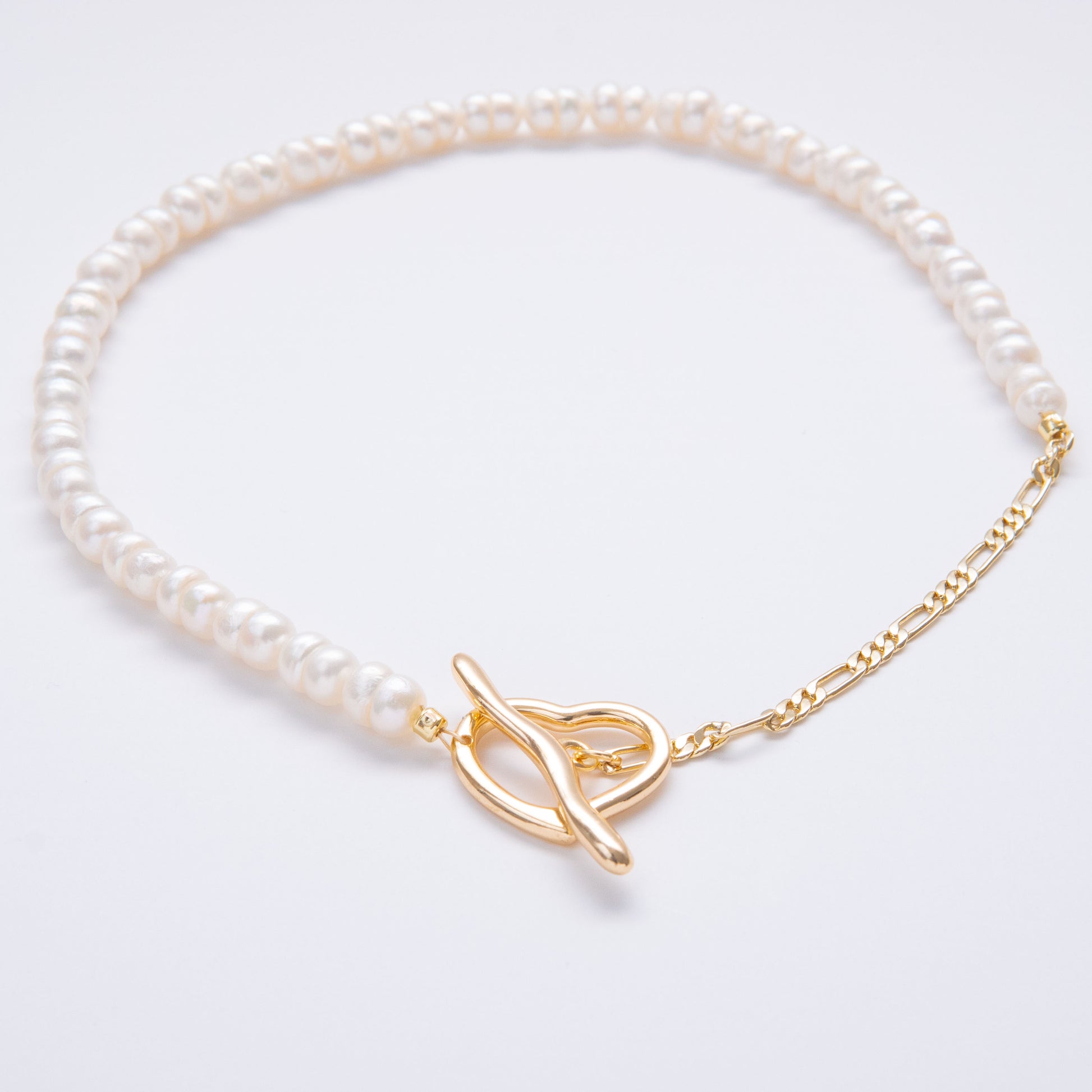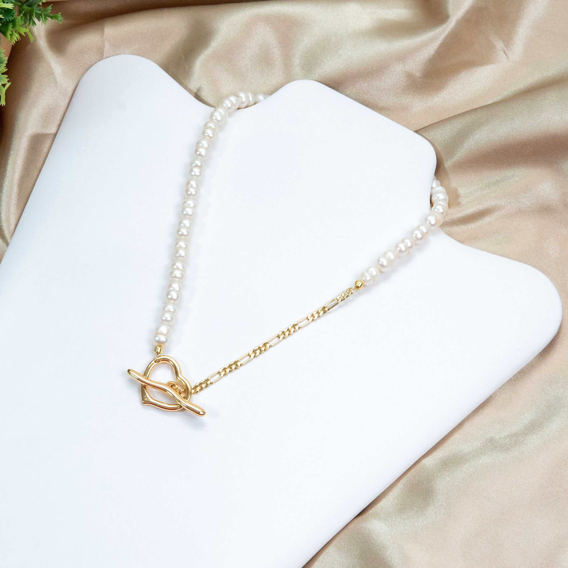 One of a kind 14-inch handmade chocker necklace with white cultured pearls from India styled with a figaro 14k gold filled chain and a beautiful front heart clasp as a statement.