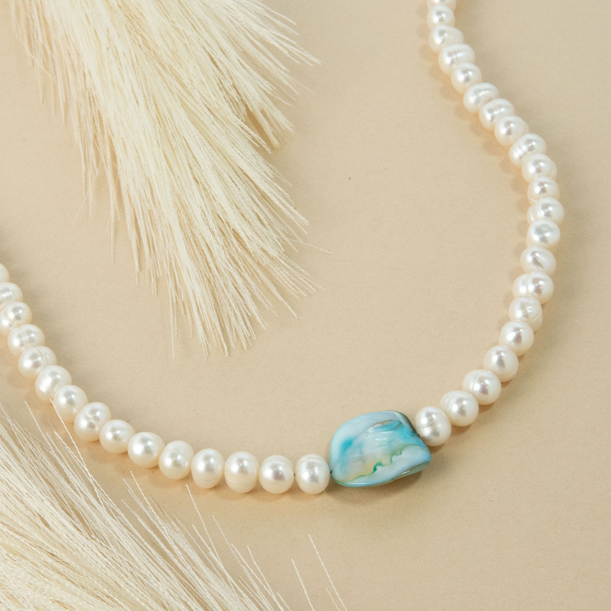 First Lady Necklace – Cultured Pearl Choker with Blue Nacre Charm