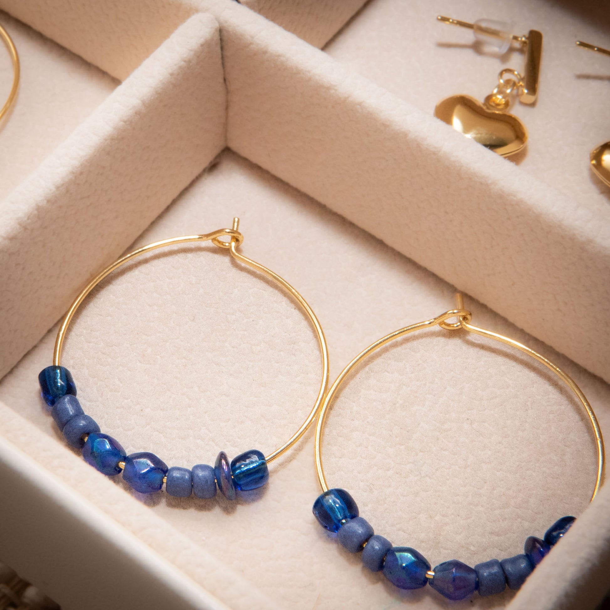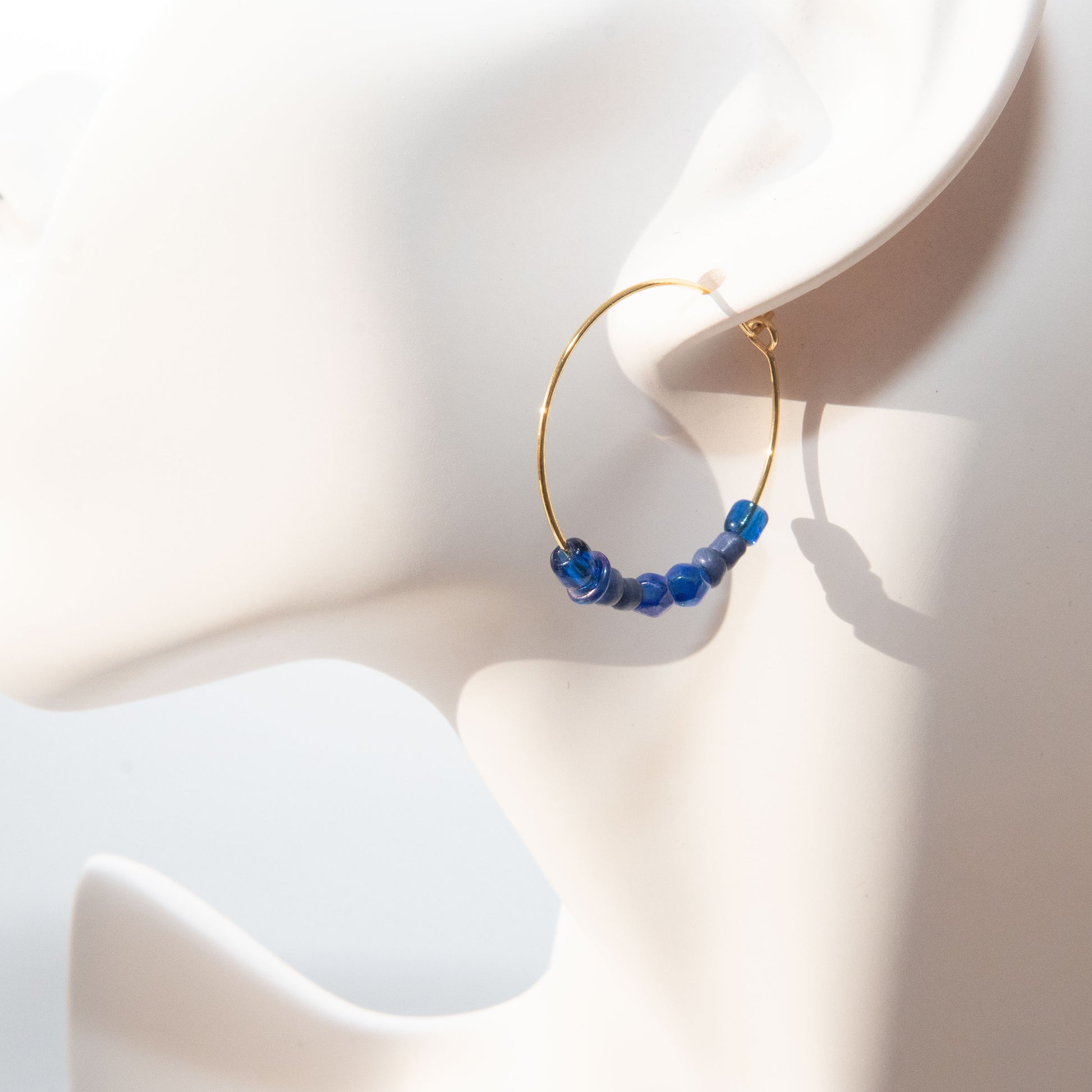 These Gold Lapiz Blue Hoop Earrings are expertly crafted with blue ocean lapiz lazuli gemstone interlaced with a gold-plated hoop earring.