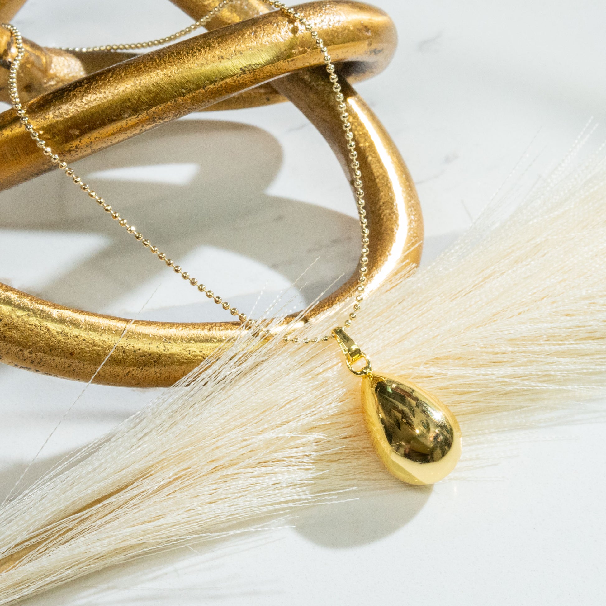 Minimalist gold teardrop necklace with a sleek and timeless design, featuring a polished teardrop pendant on a delicate sparkling bead 18k gold-filled chain. Perfect for everyday wear or special occasions, adding a touch of sophistication to any outfit.