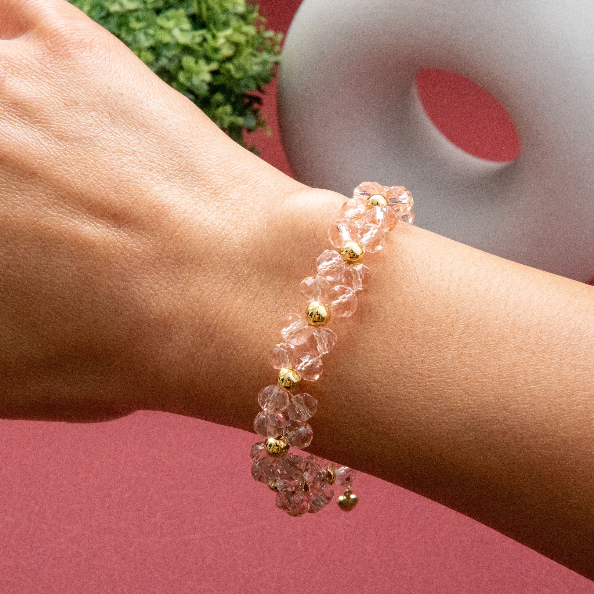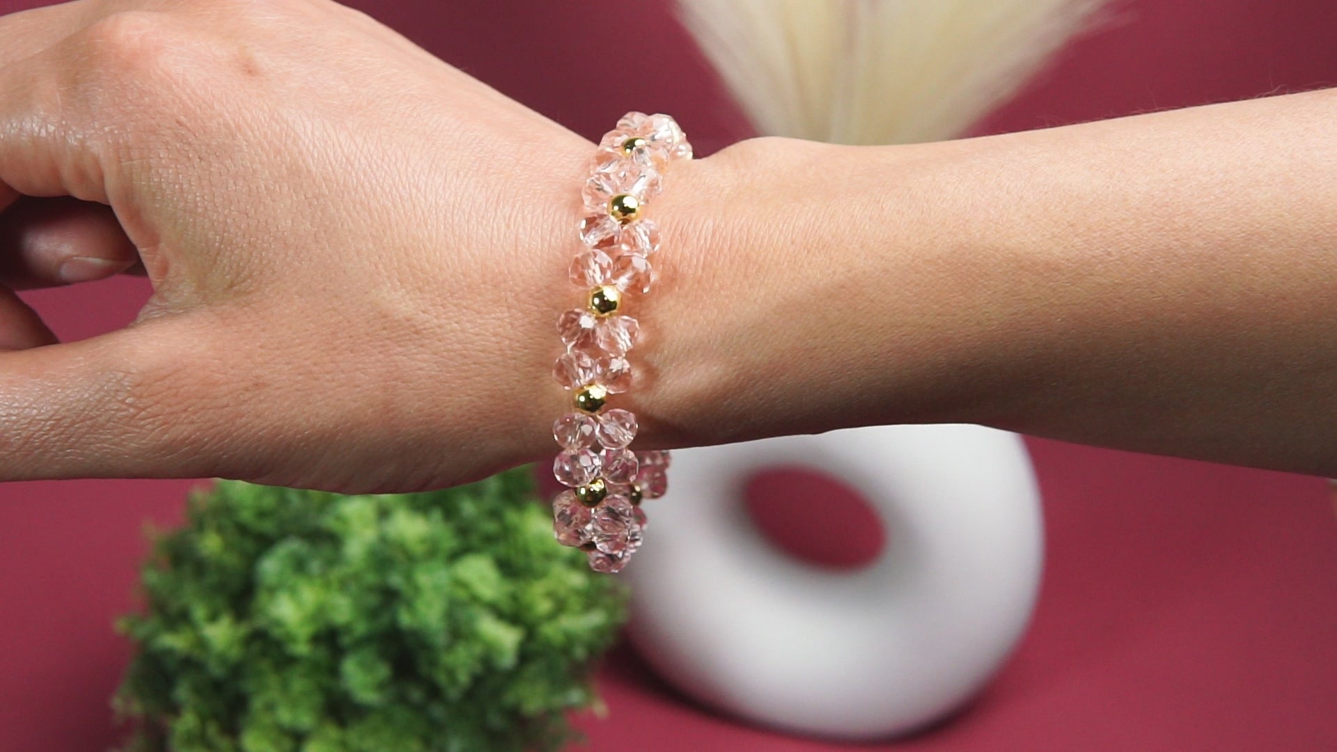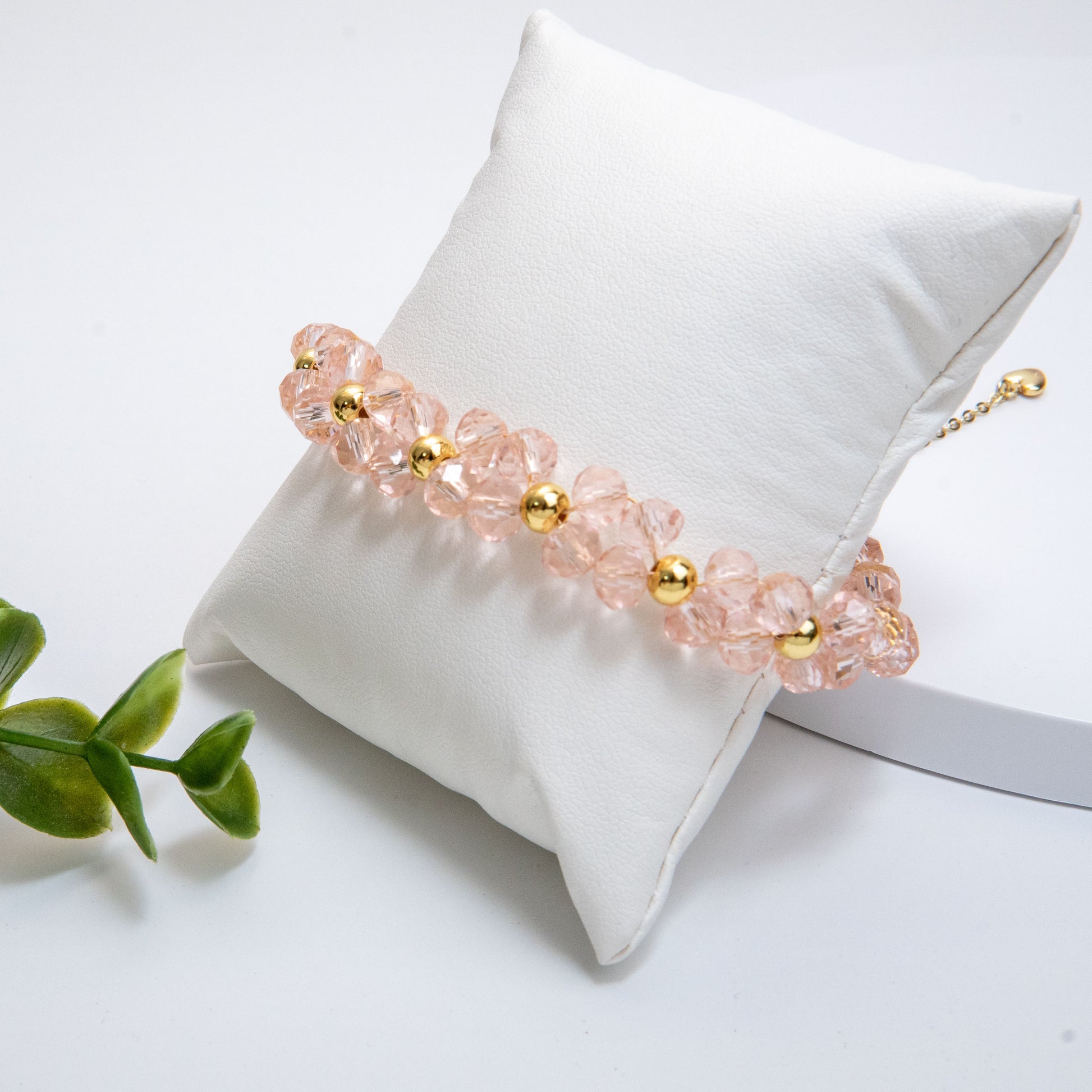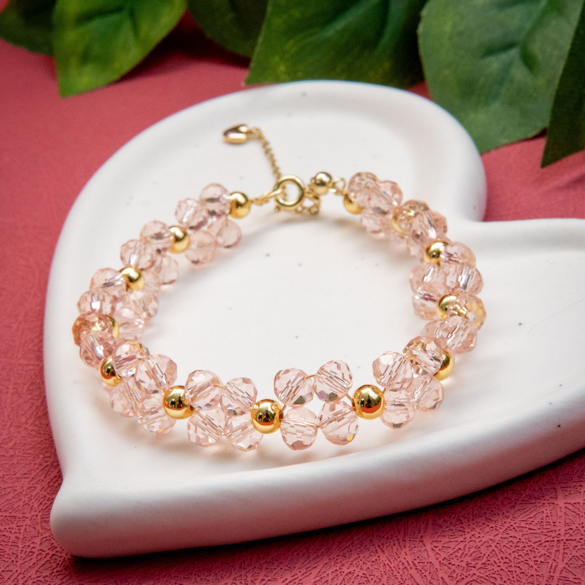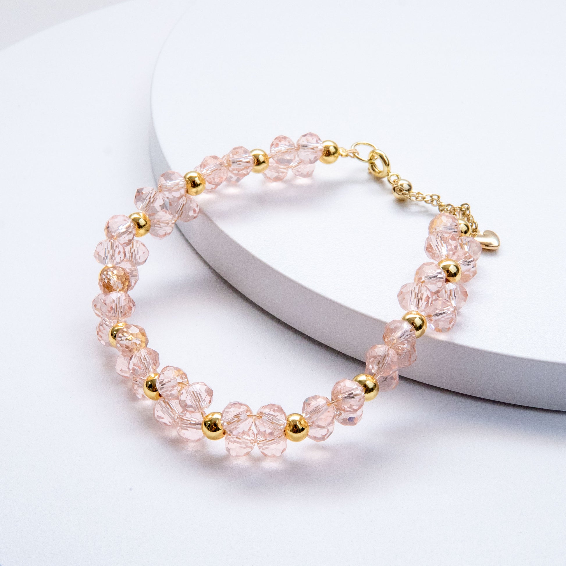 Add a touch of holiday sparkle with this elegant handmade water pink crystal bracelet. Featuring delicate faceted crystals in a soft pink hue and gold accents, this bracelet exudes timeless charm.