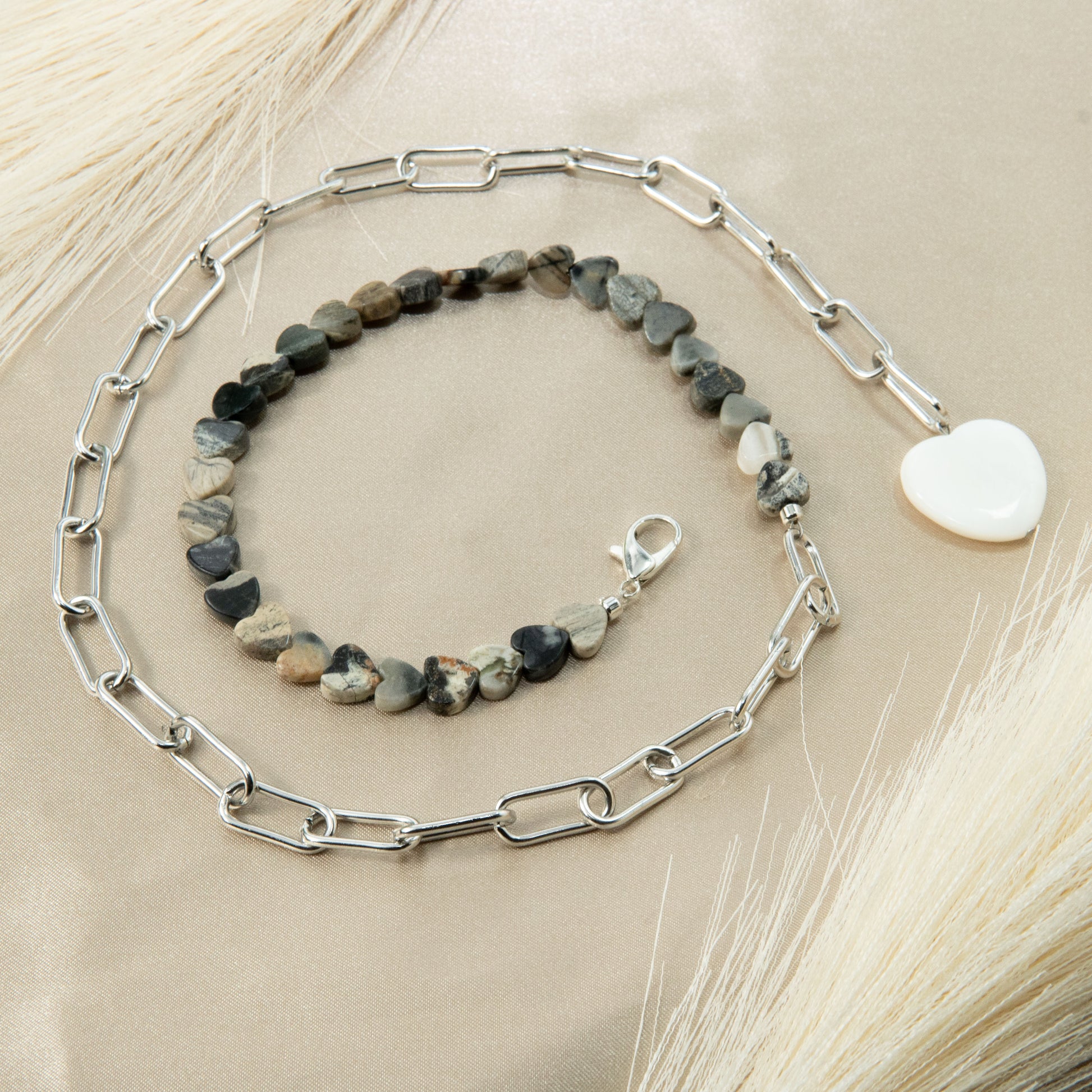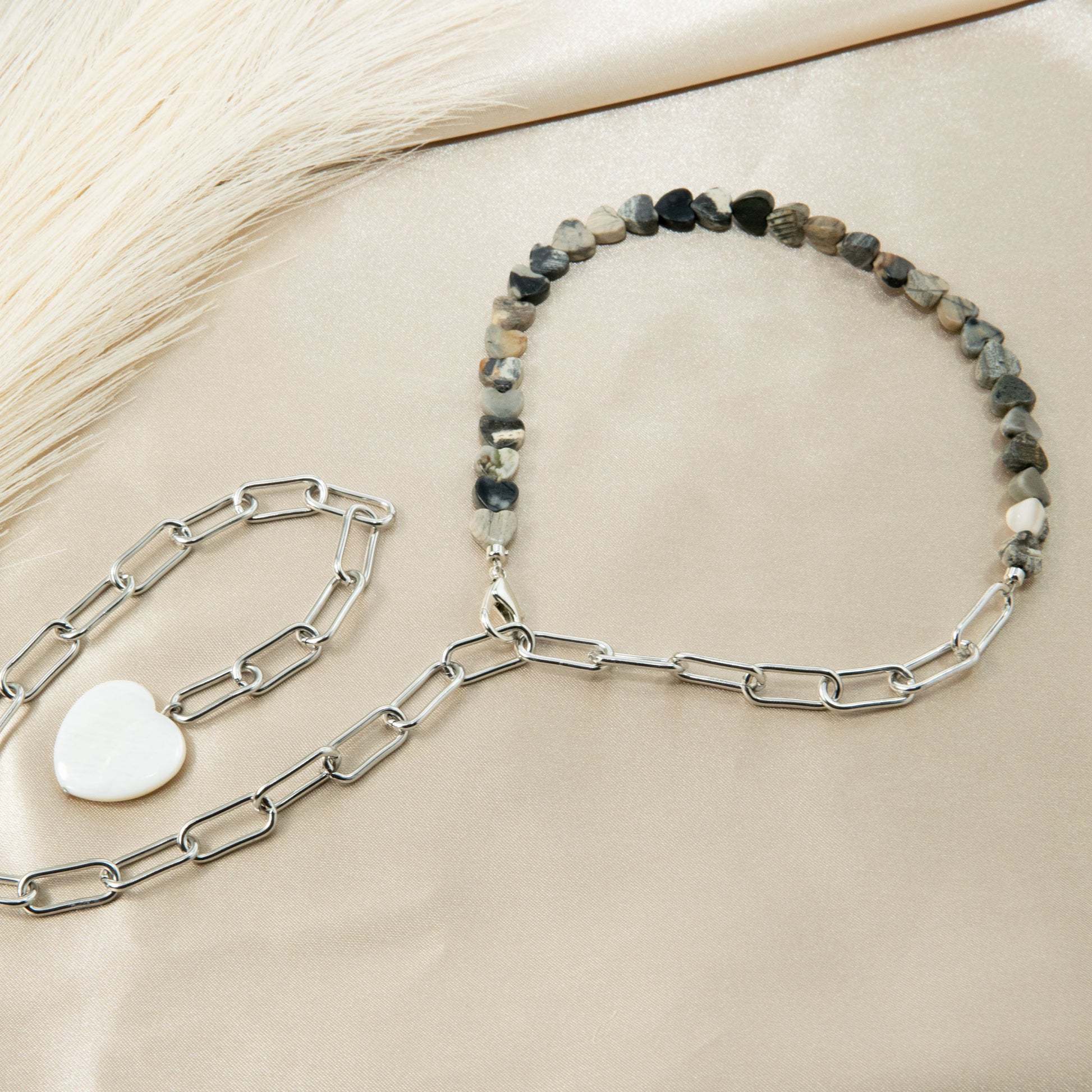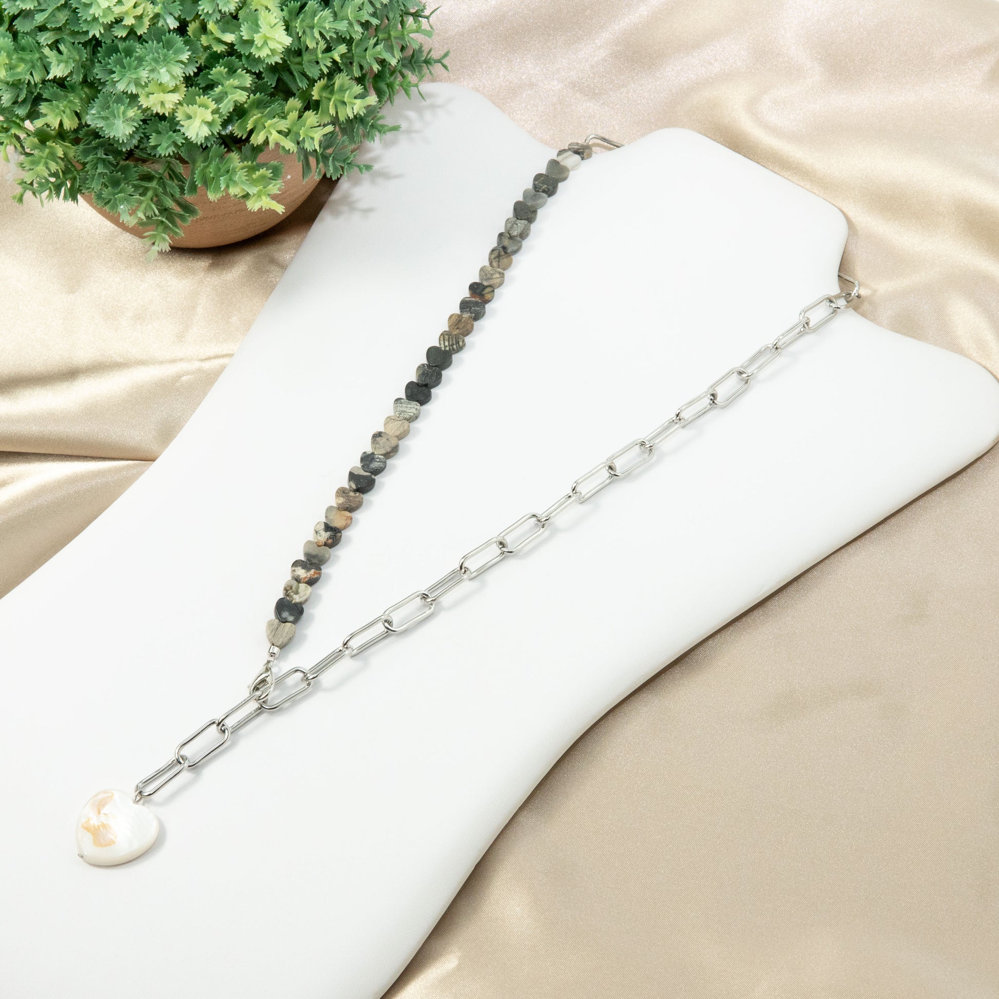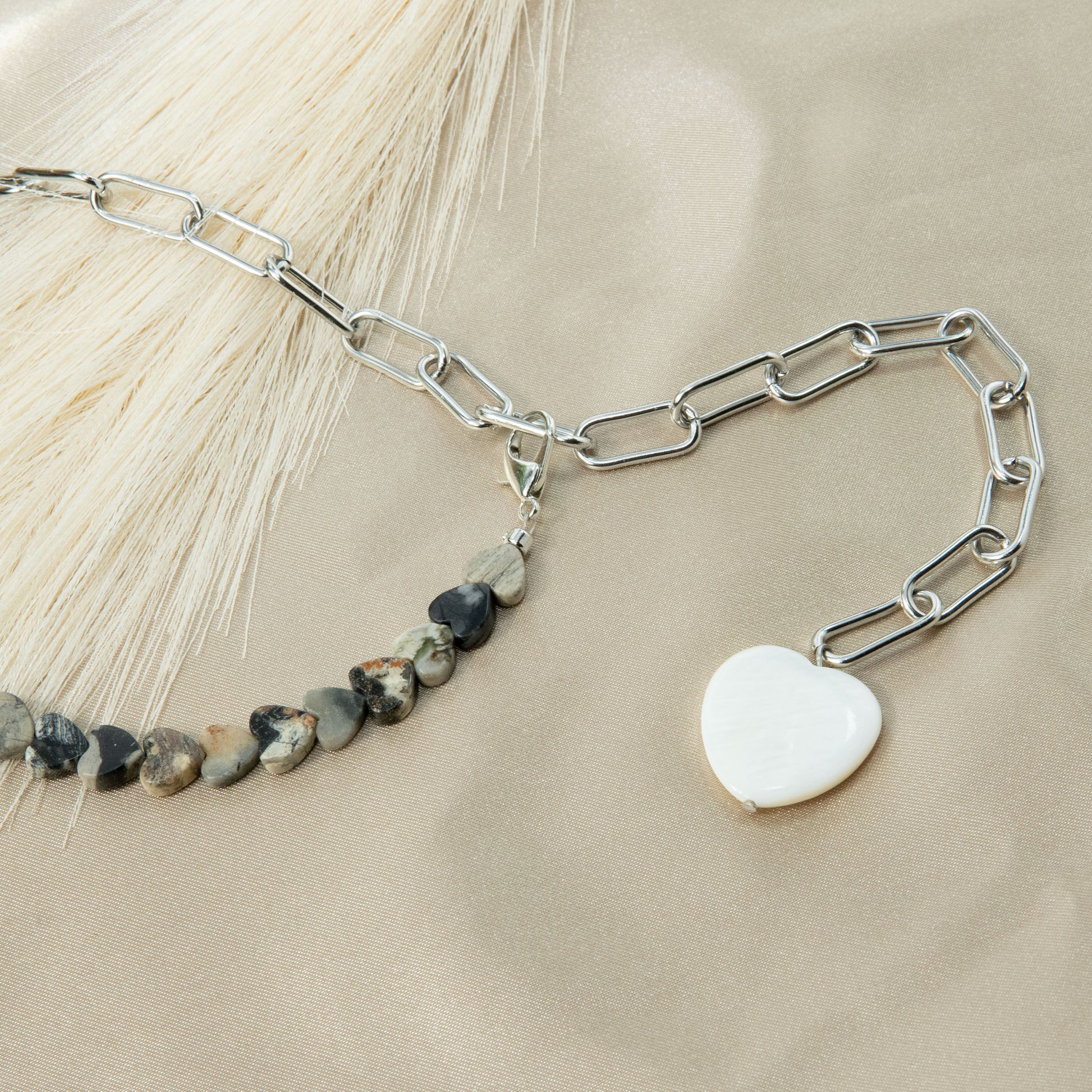 Embrace elegance and versatility with the Longing Heart Adjustable Necklace. This handcrafted piece features a luminous mother of pearl heart pendant, gracefully complemented by delicate small hearts-shaped Jasper Picasso stones. The stainless-steel bulky paperclip chain offers a modern touch, while its 30-inch adjustable length ensures a perfect fit for any neckline.