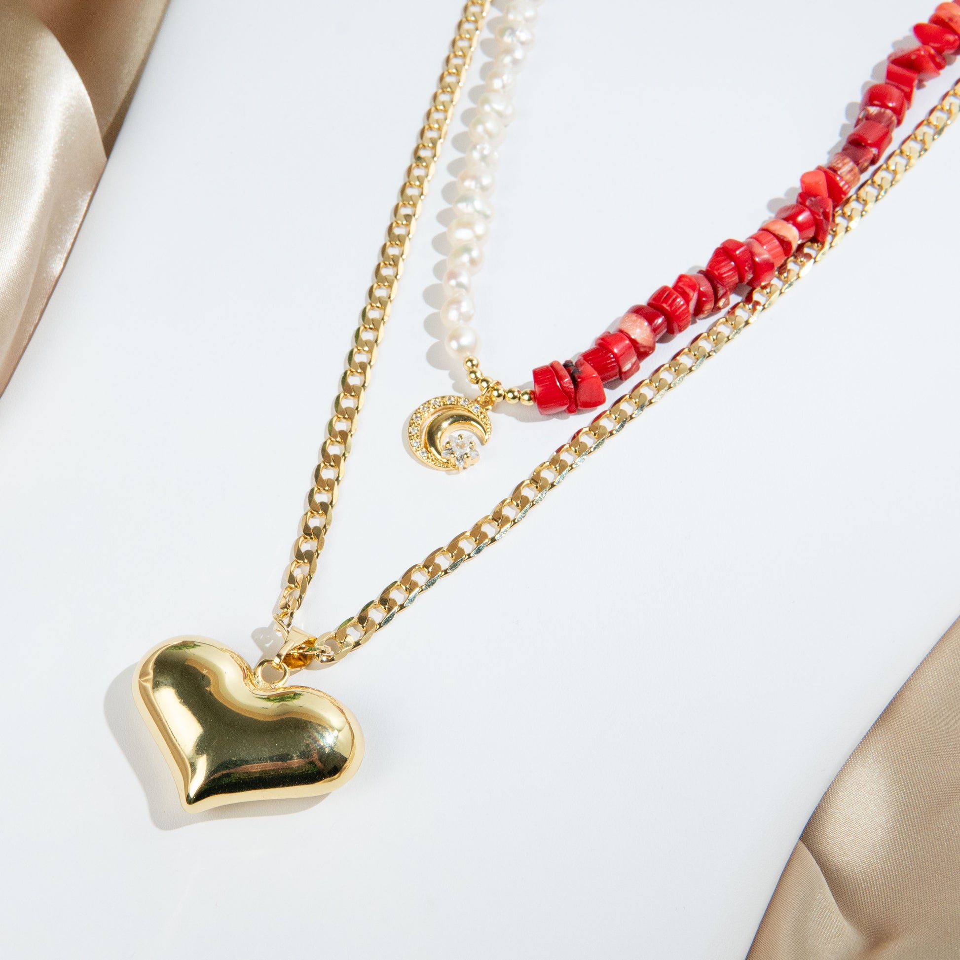The Moon Lover Stackable Necklace is a celestial-inspired piece, perfect for layering or wearing alone. It features a delicate beaded choker with a crescent moon pendant, elegantly complemented by natural freshwater pearls and bamboo red coral gemstones.