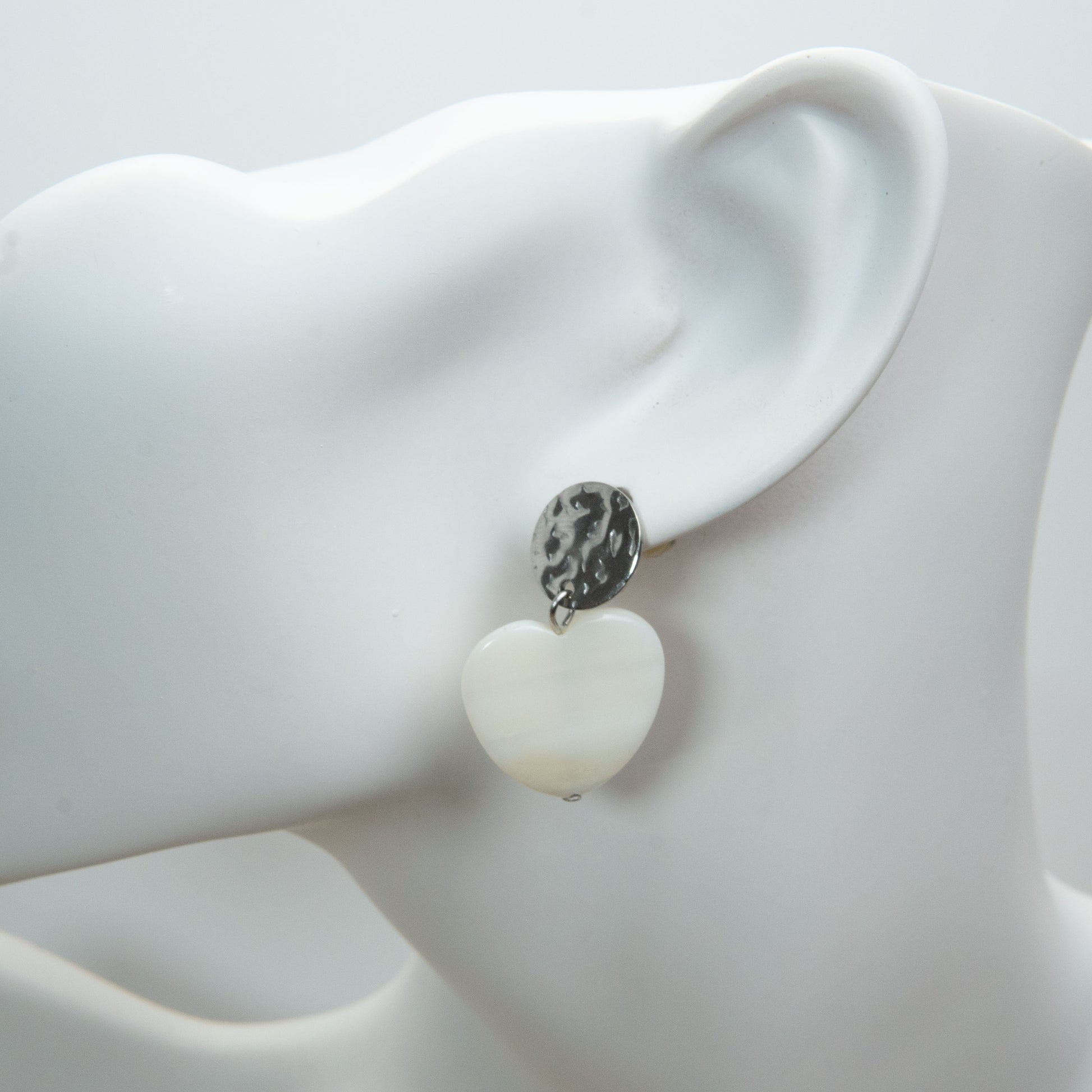 These Mother Pearl Heart Dangle Earrings are a stylish and elegant accessory. Crafted with sterling silver studs and featuring a heart-shaped mother pearl stone, they provide a minimalist yet chic look. Perfect for adding a touch of sophistication to any outfit.