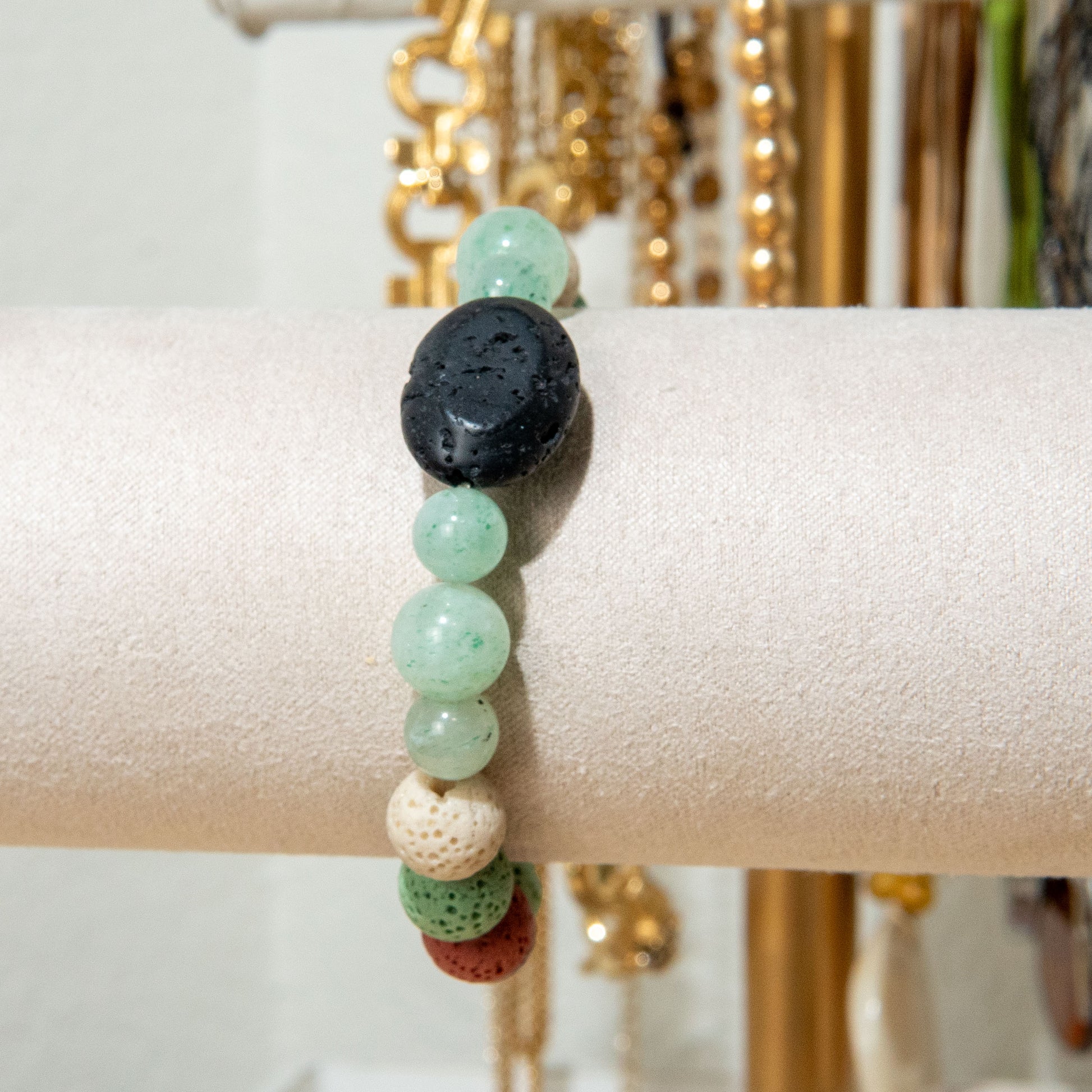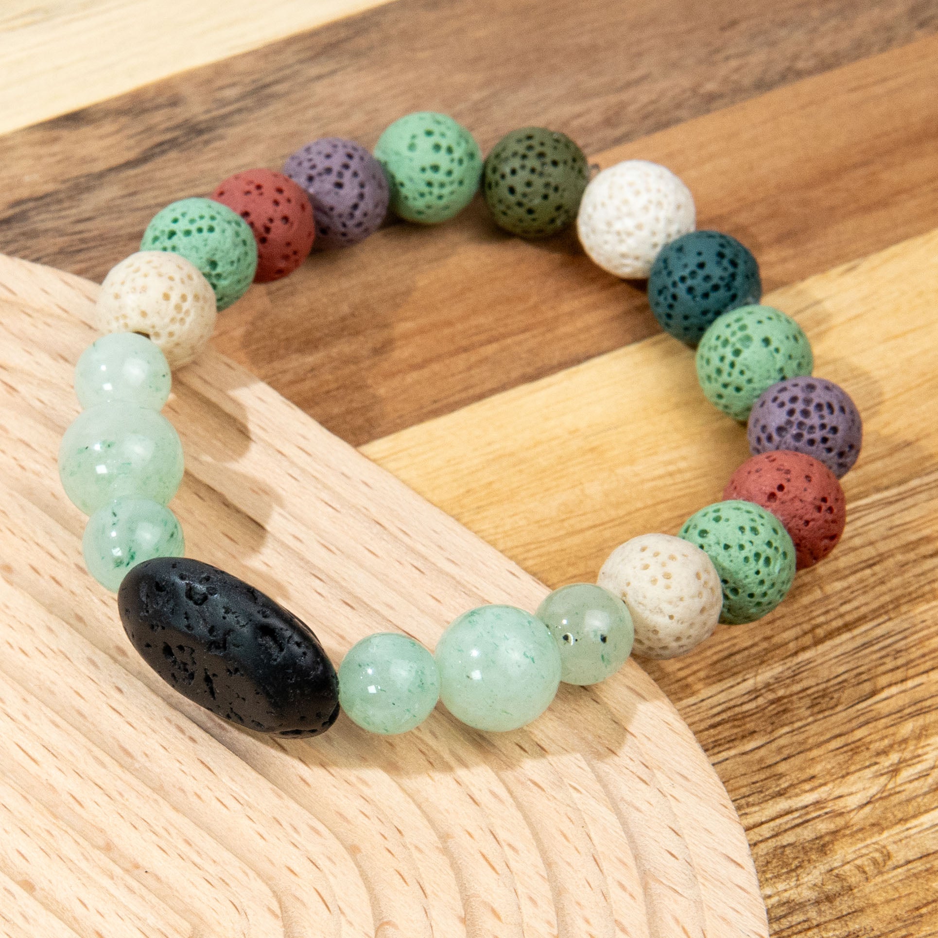 佩戴我们的 Outdoorsy 绿色熔岩手链,踏上户外探险之旅,这是一款以自然为灵感的配饰,体现了探索精神。这款手链采用真正的绿色东陵石和多孔熔岩珠制成,不仅散发出朴实的优雅气息,还能让您喜爱的精油扩散。
