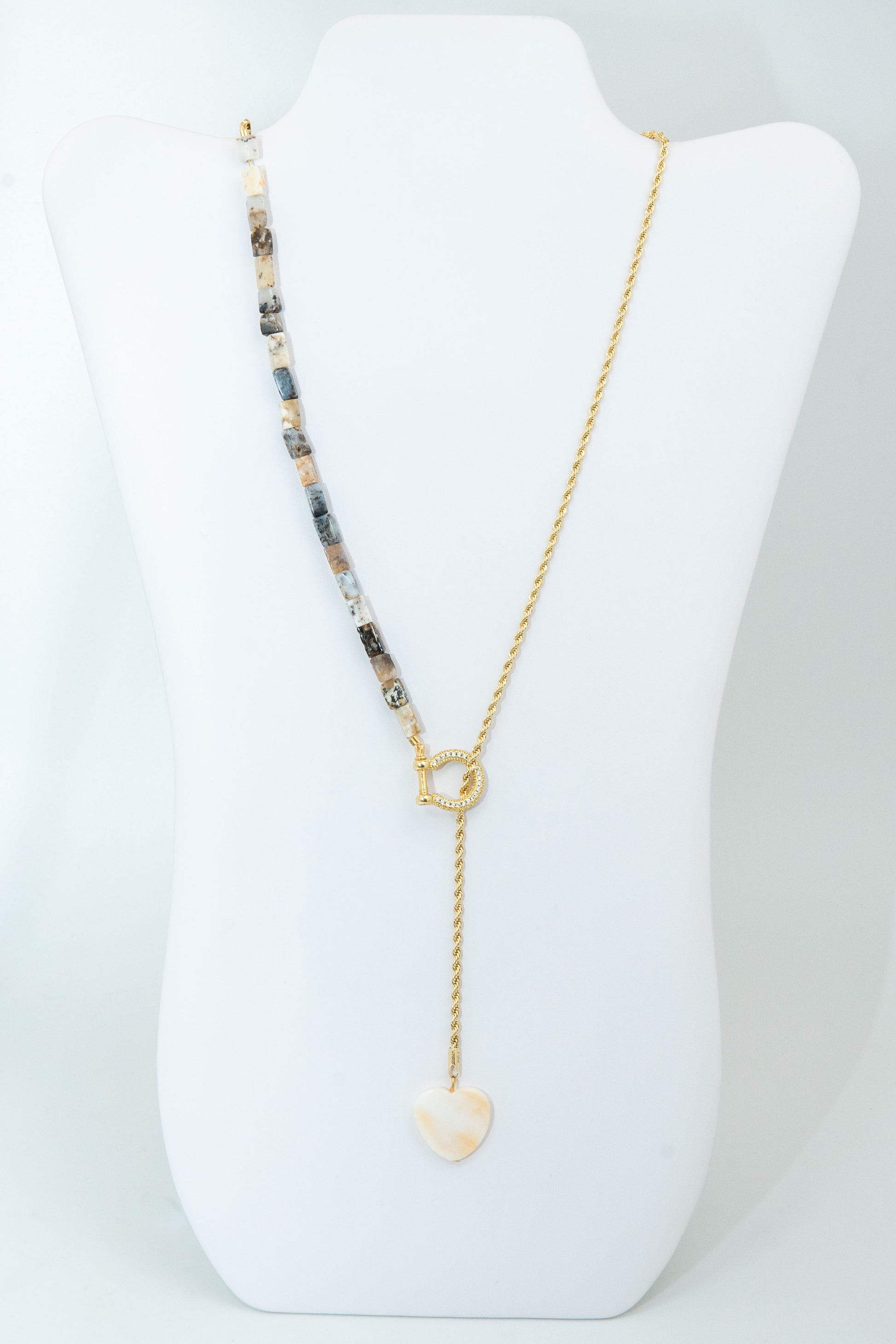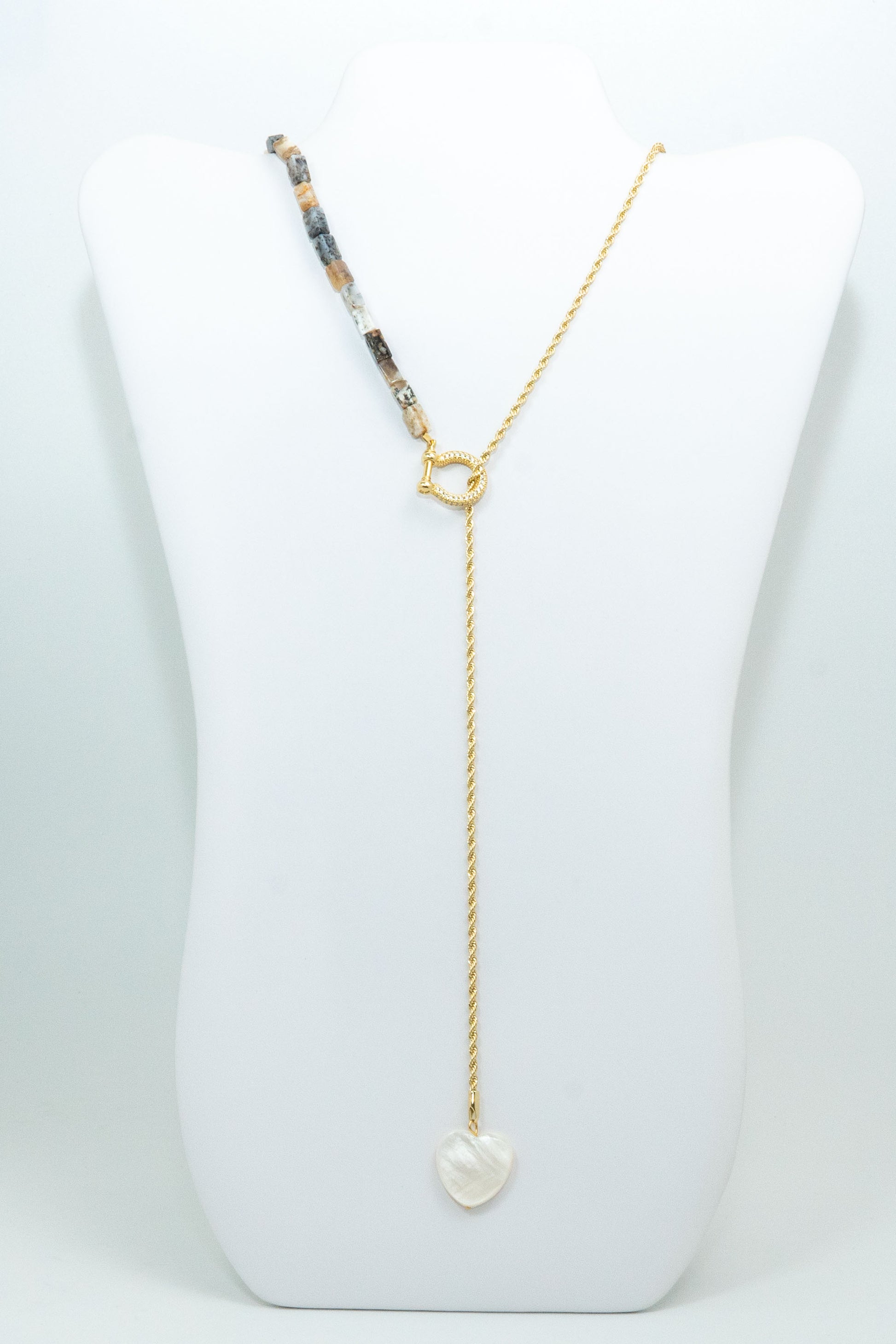 Handcrafted with meticulous detail, this statement piece showcases the iridescence of mother pearl in a heart shaped pendant beautifully complemented by the earthy tones of agata stone covering half of the necklace and 18k gold filled braided chain passing through a rhinestone covered horseshow toggle clasp.
